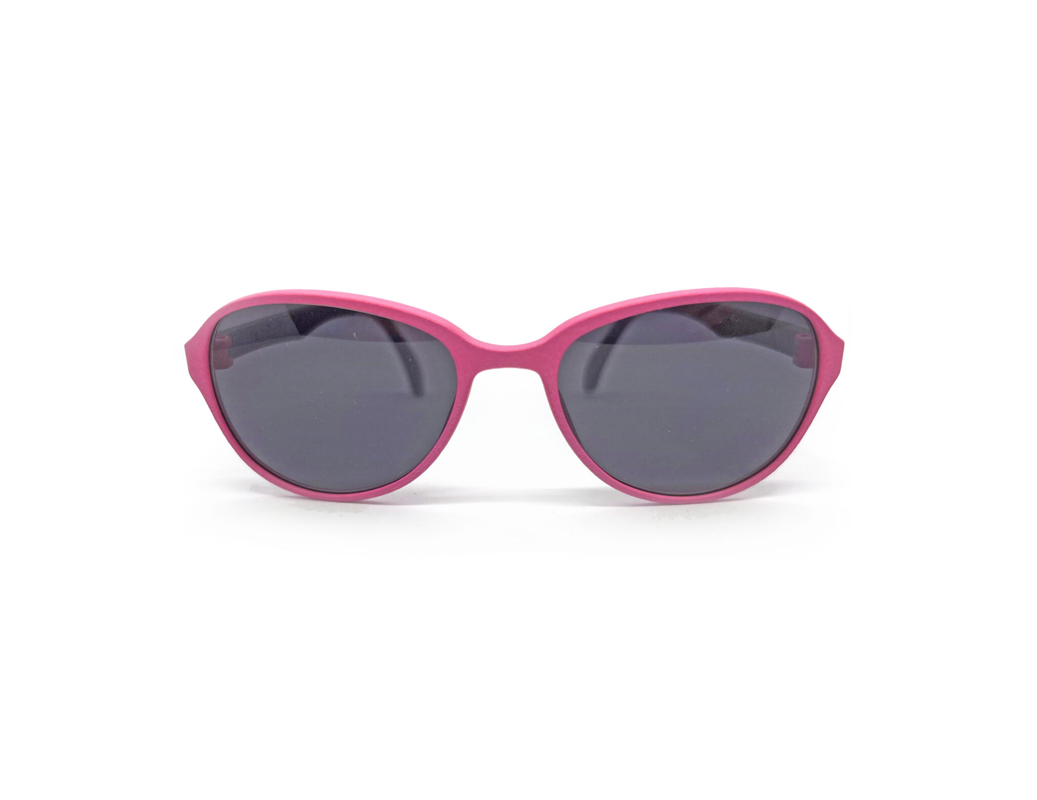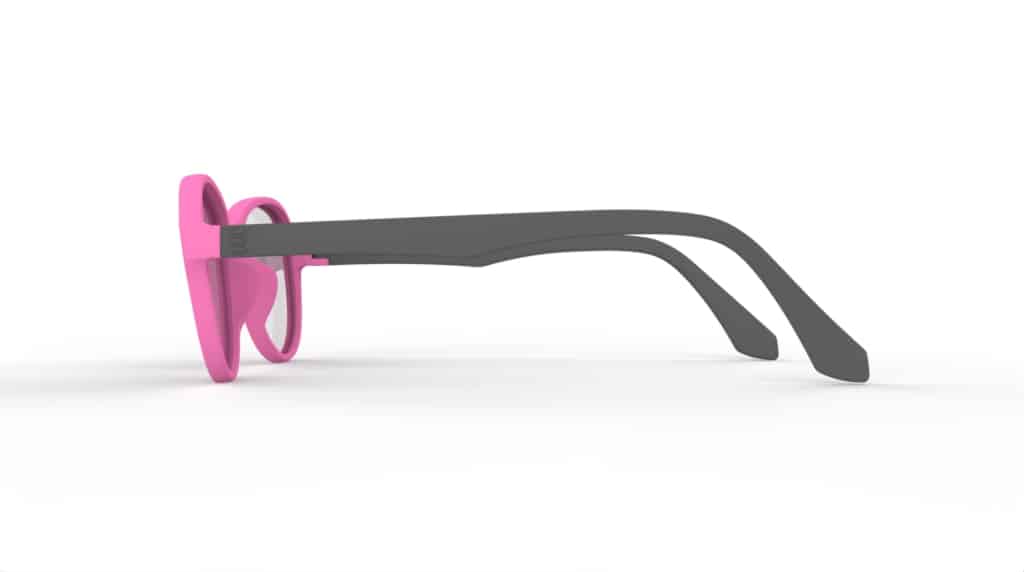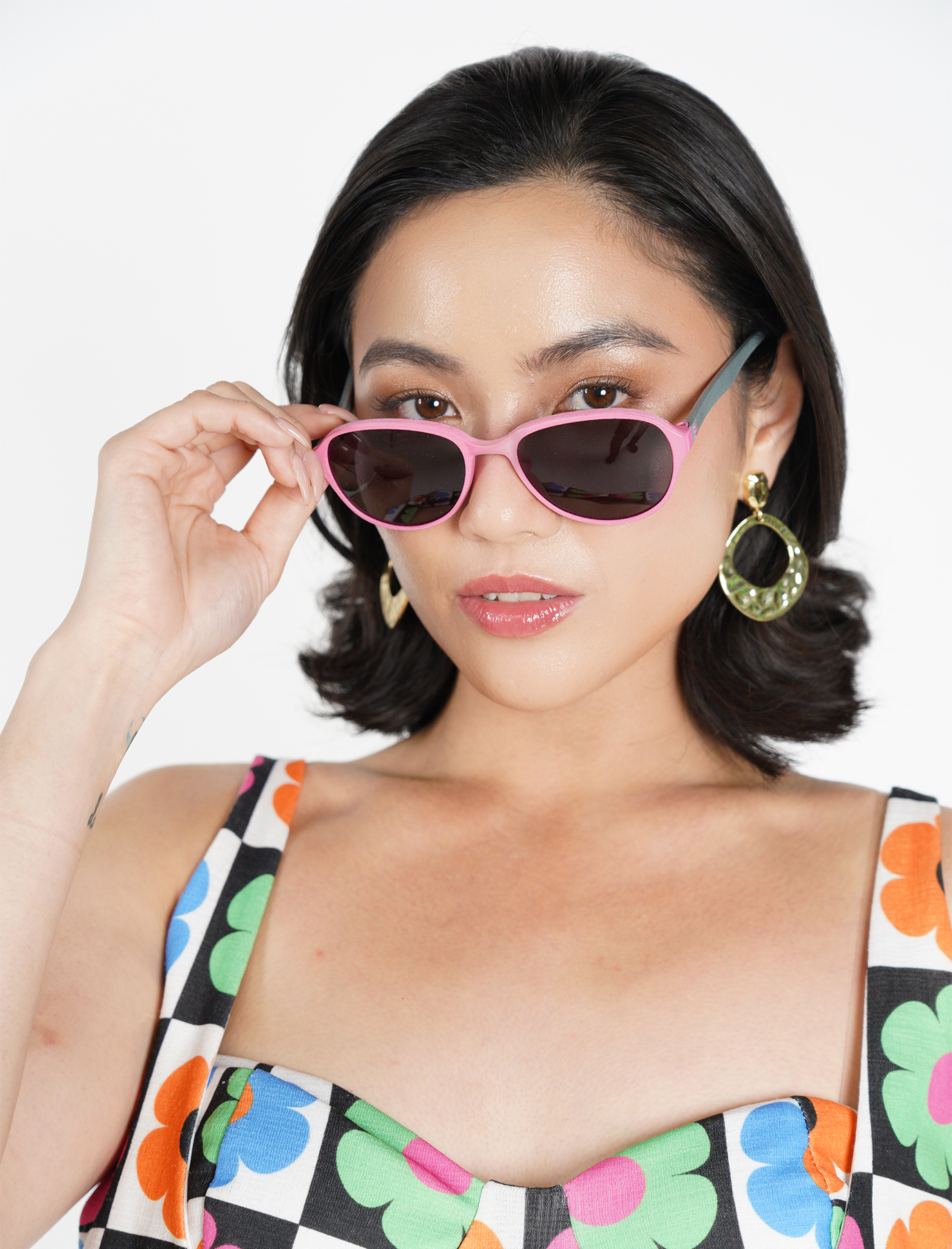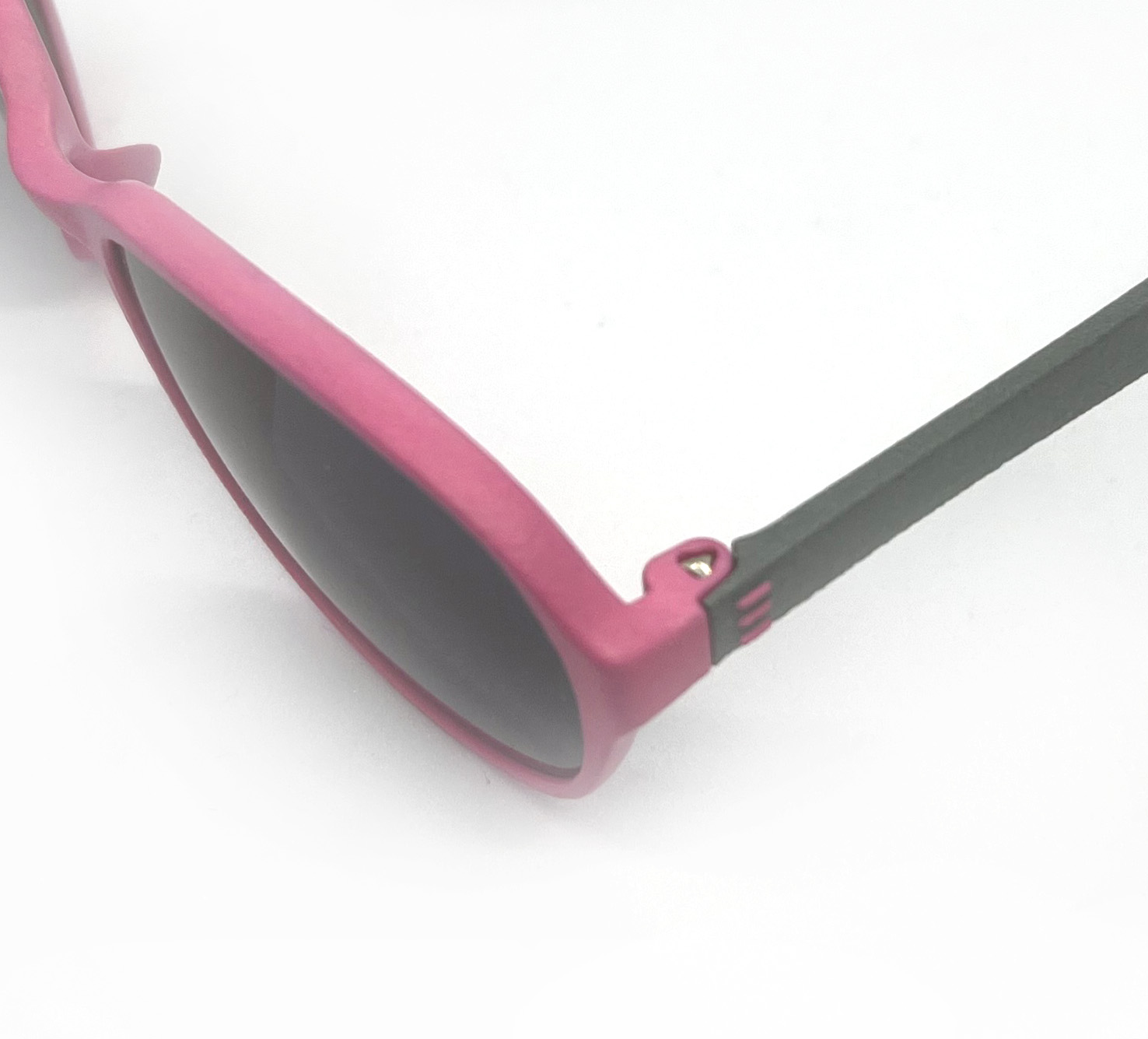 Classic sunglasses with 3D printed frames. Available in cool light blue with striped-pattern temples and warm pink and charcoal colour combinations.